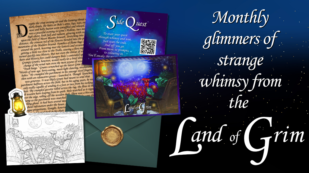 ⚔️ A link to your monthly side quests, which include: A downloadable original colouring page by Grim Poppy, a writing prompt inspired by the story, a whimsical tip for life and a mystery quest or item.